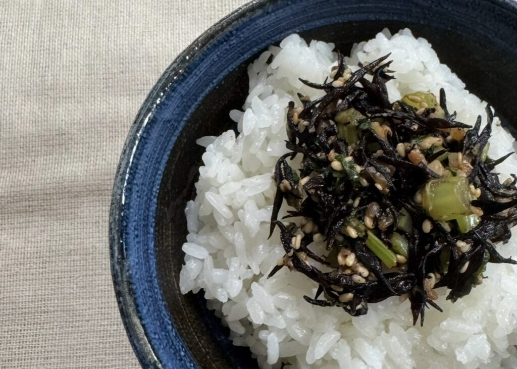 食物繊維が豊富なひじきを使ったふりかけは、子供も喜んで食べてくれるメニュー。白米に混ぜておにぎりにしたら、それ一つでも“罪悪感のない”軽食やおやつにもなります。大根の葉や胡麻、麹をプラスして、より腸活力アップを狙います。